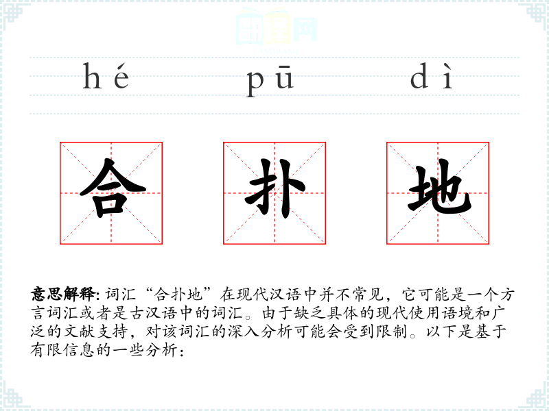 词汇“合扑地”在现代汉语中并不常见,它可能是一个方言词汇或者是古汉语中的词汇。由于缺乏具体的现代使用语境和广泛的文献支持,对该词汇的深入分析可能会受到限制。以下是基于有限信息的一些分析: