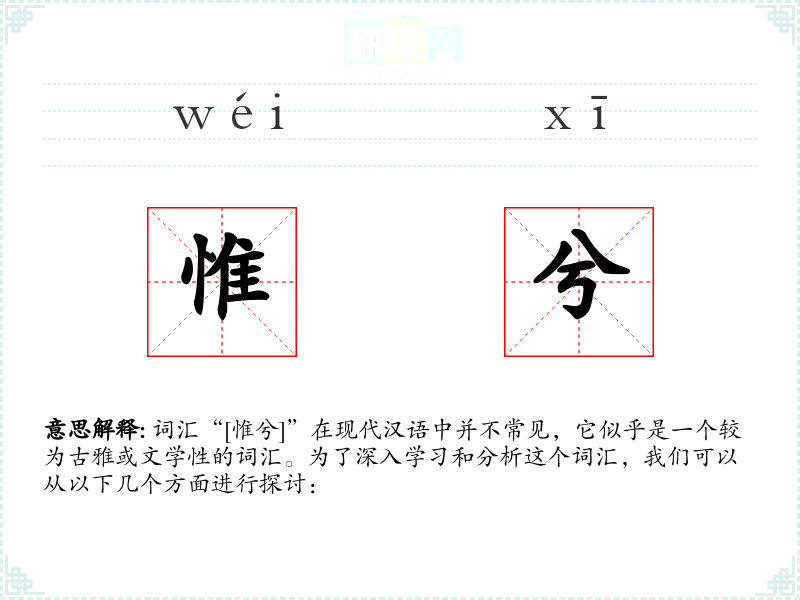 词汇“[惟兮]”在现代汉语中并不常见,它似乎是一个较为古雅或文学性的词汇。为了深入学习和分析这个词汇,我们可以从以下几个方面进行探讨: