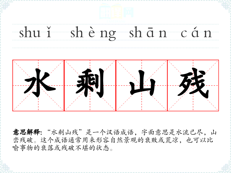 “水剩山残”是一个汉语成语,字面意思是水流已尽,山峦残破。这个成语通常用来形容自然景观的衰败或荒凉,也可以比喻事物的衰落或残破不堪的状态。