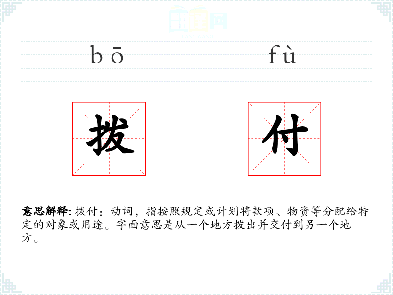 拨付:动词,指按照规定或计划将款项、物资等分配给特定的对象或用途。字面意思是从一个地方拨出并交付到另一个地方。