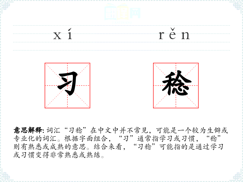 词汇“习稔”在中文中并不常见,可能是一个较为生僻或专业化的词汇。根据字面组合,“习”通常指学习或习惯,“稔”则有熟悉或成熟的意思。结合来看,“习稔”可能指的是通过学习或习惯变得非常熟悉或熟练。