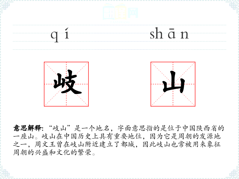 “岐山”是一个地名,字面意思指的是位于陕西省的一座山。岐山在历史上具有重要地位,因为它是周朝的发源地之一,周文王曾在岐山附近建立了都城,因此岐山也常被用来象征周朝的兴盛和文化的繁荣。