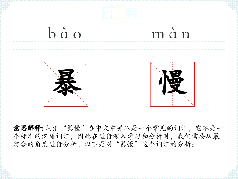 由于“暴慢”不是一个标准词汇,我们无法给出一个确切的字面意思和基本含义。它可能是由“暴”和“慢”两个字组合而成的一个非标准词汇,可能是某个特定社群或个人创造的词汇。