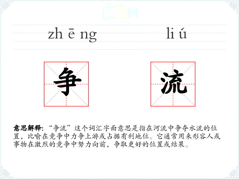 “争流”这个词汇字面意思是指在河流中争夺水流的位置,比喻在竞争中力争上游或占据有利地位。它通常用来形容人或事物在激烈的竞争中努力向前,争取更好的位置或结果。