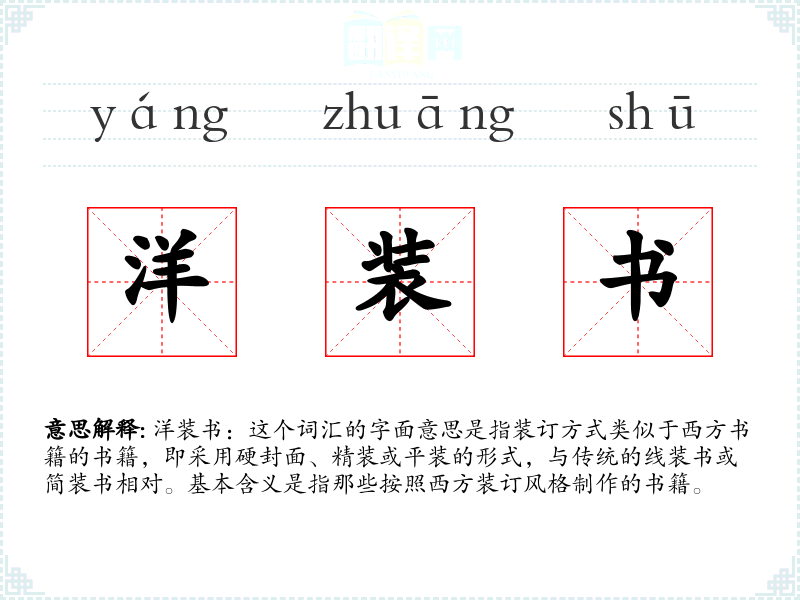 洋装书:这个词汇的字面意思是指装订方式类似于西方书籍的书籍,即采用硬封面、精装或平装的形式,与传统的线装书或简装书相对。基本含义是指那些按照西方装订风格制作的书籍。
