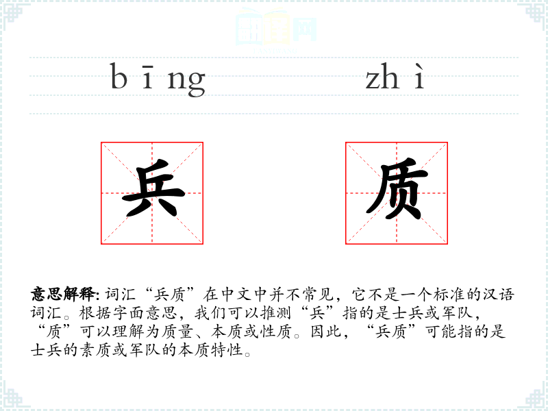词汇“兵质”在中文中并不常见,它不是一个标准的汉语词汇。根据字面意思,我们可以推测“兵”指的是士兵或军队,“质”可以理解为质量、本质或性质。因此,“兵质”可能指的是士兵的素质或军队的本质特性。