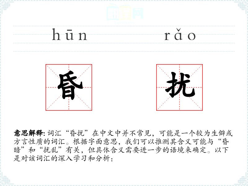 词汇“昏扰”在中文中并不常见,可能是一个较为生僻或方言性质的词汇。根据字面意思,我们可以推测其含义可能与“昏暗”和“扰乱”有关,但具体含义需要进一步的语境来确定。以下是对该词汇的深入学习和分析: