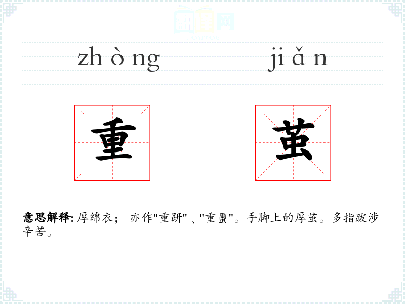 厚绵衣; 亦作"重趼"﹑"重蠒"。手脚上的厚茧。多指跋涉辛苦。