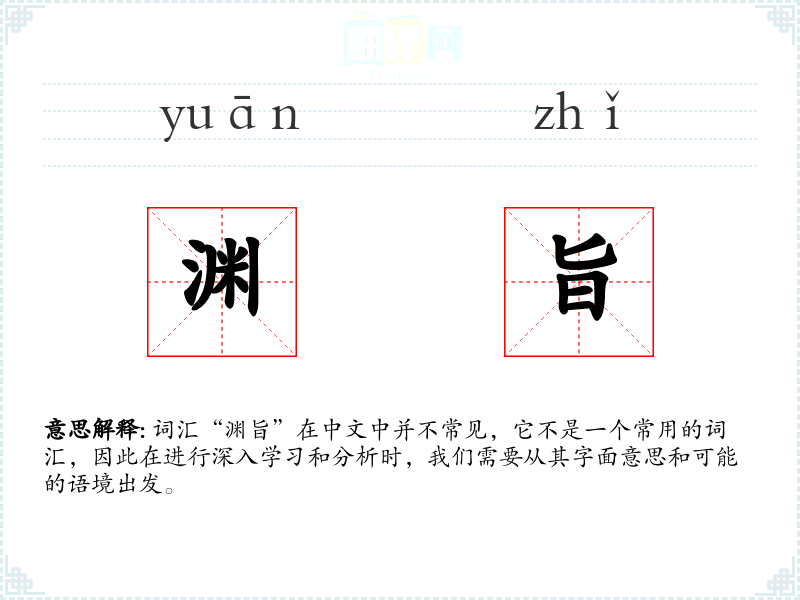 词汇“渊旨”在中文中并不常见,它不是一个常用的词汇,因此在进行深入学*和分析时,我们需要从其字面意思和可能的语境出发。