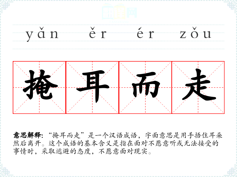 “掩耳而走”是一个汉语成语,字面意思是用手捂住耳朵然后离开。这个成语的基本含义是指在面对不愿意听或无法接受的事情时,采取逃避的态度,不愿意面对现实。