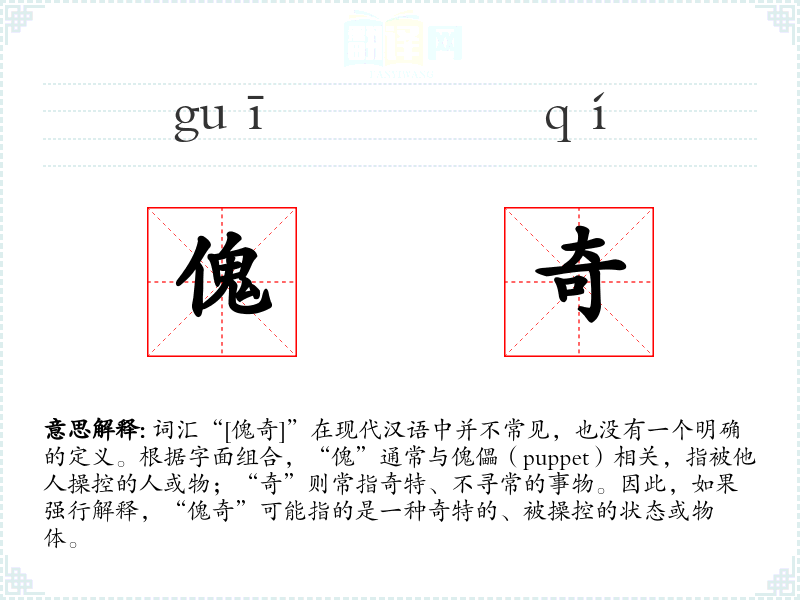 词汇“[傀奇]”在现代汉语中并不常见,也没有一个明确的定义。根据字面组合,“傀”通常与傀儡(puppet)相关,指被他人操控的人或物;“奇”则常指奇特、不寻常的事物。因此,如果强行解释,“傀奇”可能指的是一种奇特的、被操控的状态或物体。