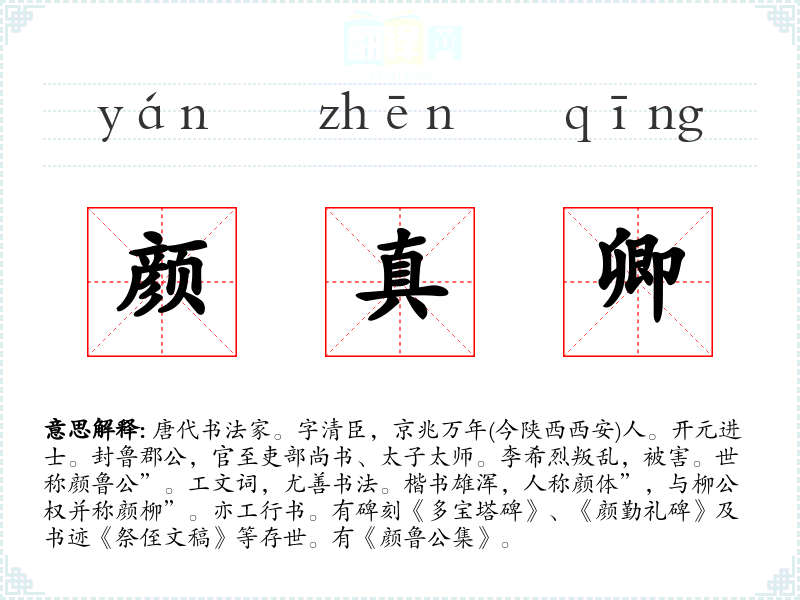 1.唐代书法家。字清臣,京兆万年(今陕西西安)人。开元进士。封鲁郡公,官至吏部尚书、太子太师。李希烈叛乱,被害。世称颜鲁公”。工文词,尤善书法。楷书雄浑,人称颜体”,与柳公权并称颜柳”。亦工行书。有碑刻《多宝塔碑》、《颜勤礼碑》及书迹《祭侄文稿》等存世。有《颜鲁公集》。