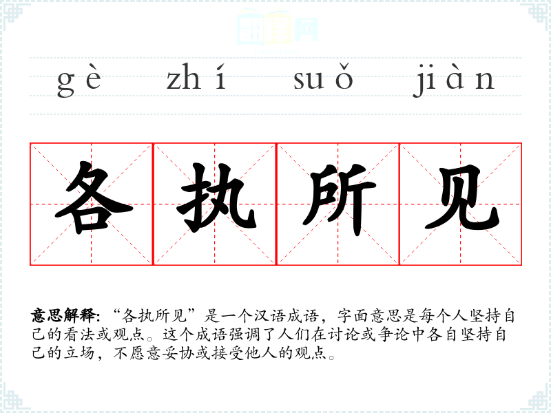 “各执所见”是一个汉语成语,字面意思是每个人坚持自己的看法或观点。这个成语强调了人们在讨论或争论中各自坚持自己的立场,不愿意妥协或接受他人的观点。