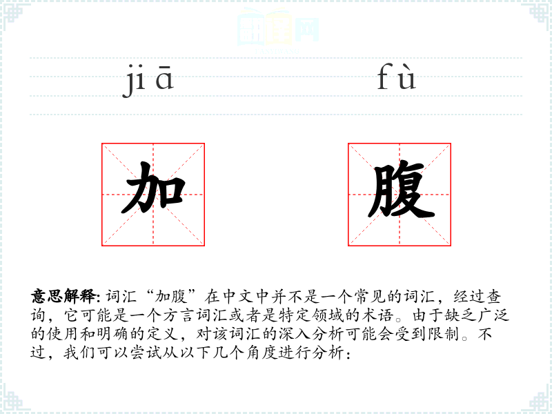 如果“加腹”是一个方言词汇,它可能在特定的地区被使用,用于描述某种特定的动作或状态。如果是专业术语,它可能在相关领域的文献或对话中出现。