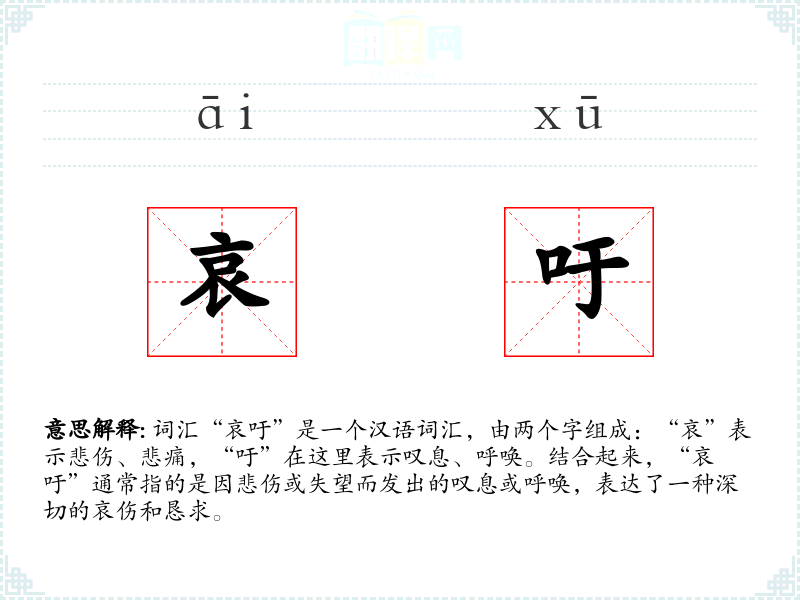 词汇“哀吁”是一个汉语词汇,由两个字组成:“哀”表示悲伤、悲痛,“吁”在这里表示叹息、呼唤。结合起来,“哀吁”通常指的是因悲伤或失望而发出的叹息或呼唤,表达了一种深切的哀伤和恳求。