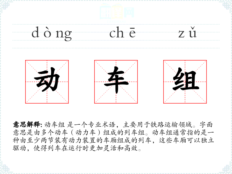 动车组 是一个专业术语,主要用于铁路运输领域。字面意思是由多个动车(动力车)组成的列车组。动车组通常指的是一种由至少两节装有动力装置的车厢组成的列车,这些车厢可以独立驱动,使得列车在运行时更加灵活和高效。