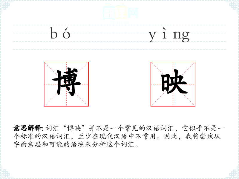 词汇“博映”并不是一个常见的汉语词汇,它似乎不是一个标准的汉语词汇,至少在现代汉语中不常用。因此,我将尝试从字面意思和可能的语境来分析这个词汇。