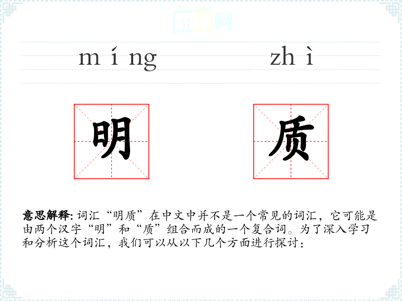 词汇“明质”在中文中并不是一个常见的词汇,它可能是由两个汉字“明”和“质”组合而成的一个复合词。为了深入学习和分析这个词汇,我们可以从以下几个方面进行探讨: