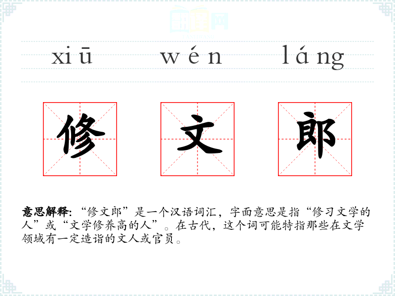 在其他文化中,可能没有直接对应“修文郎”的词汇,但类似的词汇如“文人”或“文学家”在不同语言中都有相应的表达,如英语中的“scholar”或“writer”。