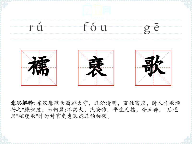 东汉廉范为蜀郡太守,政治清明,百姓富庶,时人作歌颂扬之"廉叔度,来何暮?不禁火,民安作。平生无襦,今五褲。"后遂用"襦裦歌"作为对官吏惠民德政的称颂。