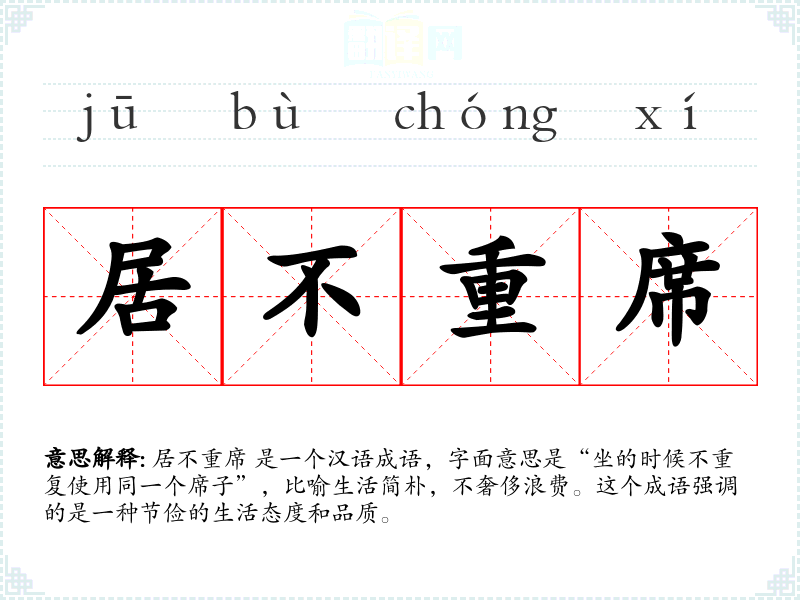 居不重席 是一个汉语成语,字面意思是“坐的时候不重复使用同一个席子”,比喻生活简朴,不奢侈浪费。这个成语强调的是一种节俭的生活态度和品质。