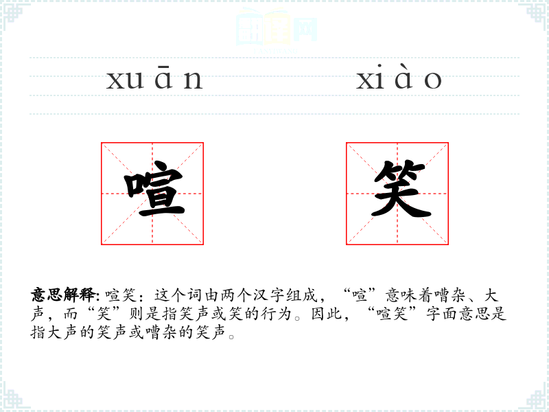 喧笑:这个词由两个汉字组成,“喧”意味着嘈杂、大声,而“笑”则是指笑声或笑的行为。因此,“喧笑”字面意思是指大声的笑声或嘈杂的笑声。