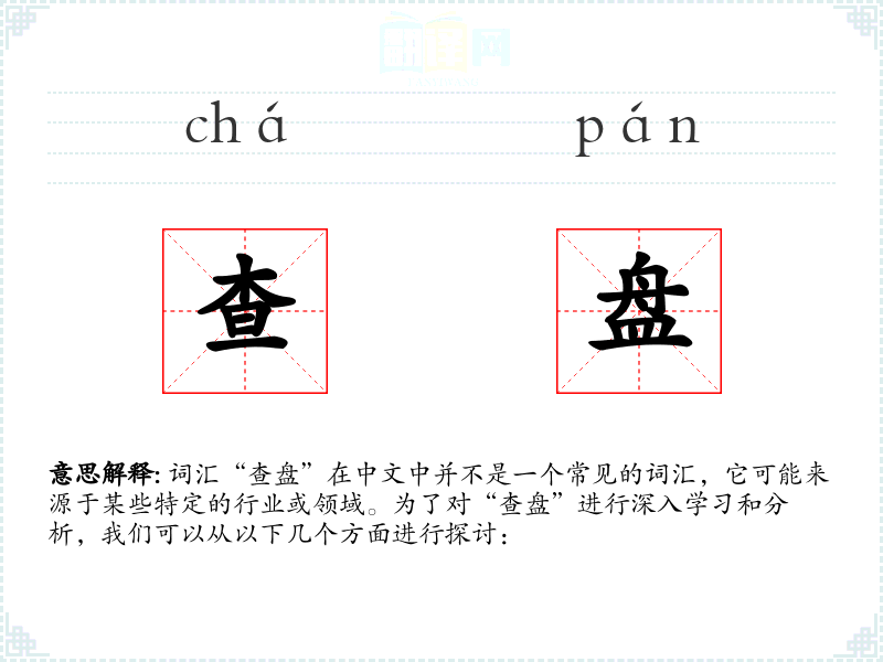词汇“查盘”在中文中并不是一个常见的词汇,它可能来源于某些特定的行业或领域。为了对“查盘”进行深入学习和分析,我们可以从以下几个方面进行探讨: