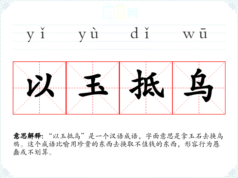 “以玉抵乌”是一个汉语成语,字面意思是拿玉石去换乌鸦。这个成语比喻用珍贵的东西去换取不值钱的东西,形容行为愚蠢或不划算。