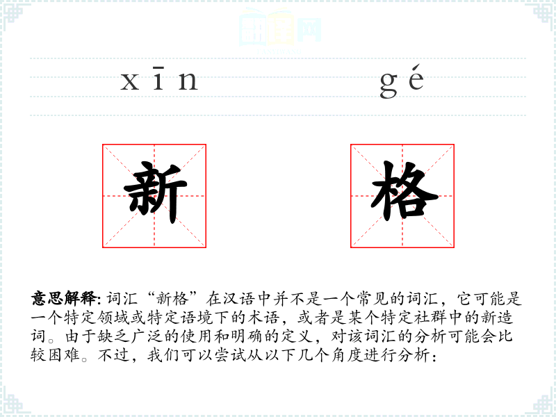由于“新格”不是一个标准词汇,对其的理解和应用可能需要依赖于特定的语境和背景。在语言学习和表达中,了解词汇的具体含义和使用场景是非常重要的。对于“新格”这样的词汇,可能需要更多的信息和上下文来准确理解其含义和用法。