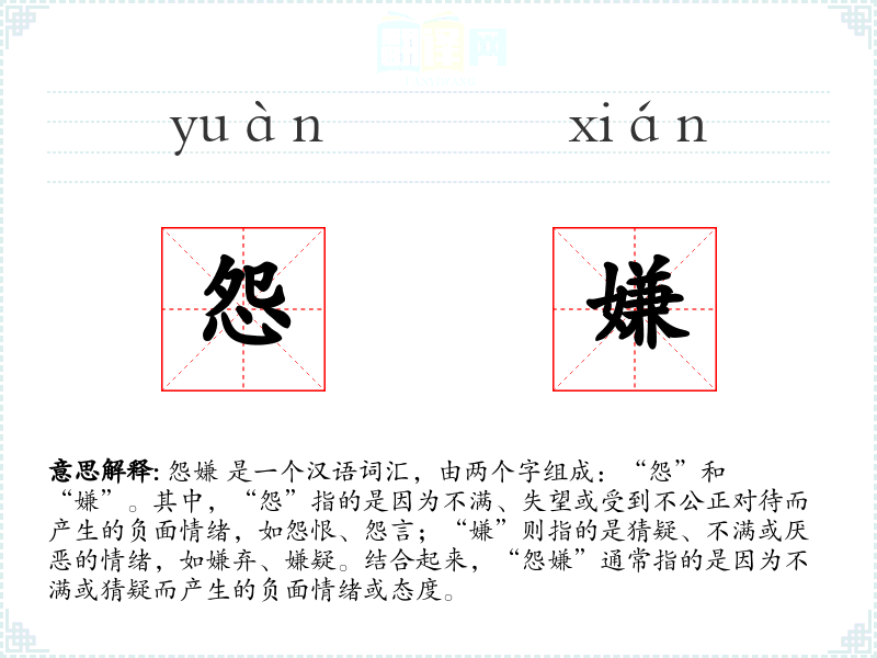 在英语中,“怨嫌”可以对应为“resentment”和“suspicion”。然而,“怨嫌”作为一个复合词,更强调了不满和猜疑的结合,这在英语中可能需要通过更复杂的句子结构来表达。