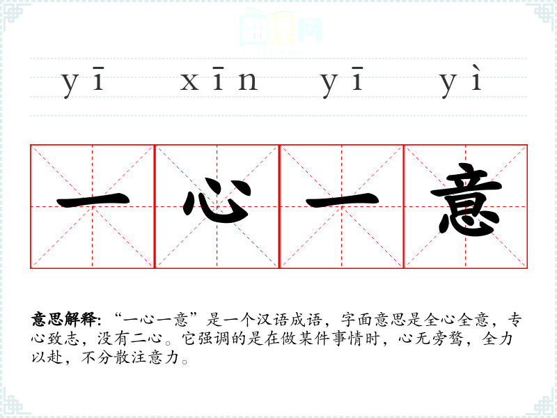 “一心一意”是一个汉语成语,字面意思是全心全意,专心致志,没有二心。它强调的是在做某件事情时,心无旁骛,全力以赴,不分散注意力。