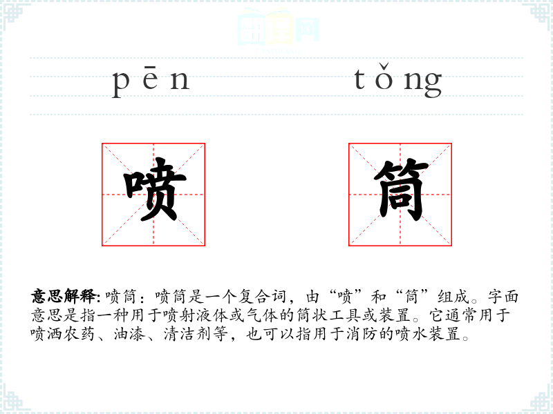 喷筒:喷筒是一个复合词,由“喷”和“筒”组成。字面意思是指一种用于喷射液体或气体的筒状工具或装置。它通常用于喷洒农药、油漆、清洁剂等,也可以指用于消防的喷水装置。