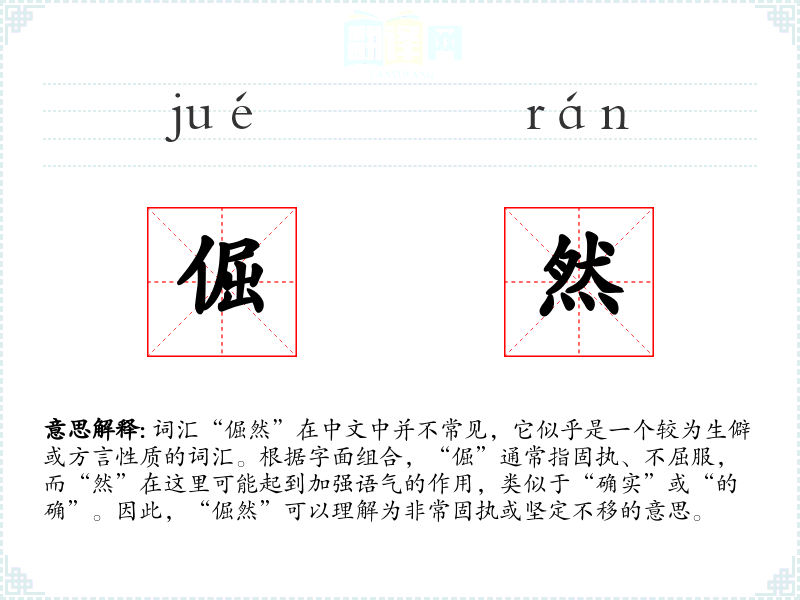 词汇“倔然”在中文中并不常见,它似乎是一个较为生僻或方言性质的词汇。根据字面组合,“倔”通常指固执、不屈服,而“然”在这里可能起到加强语气的作用,类似于“确实”或“的确”。因此,“倔然”可以理解为非常固执或坚定不移的意思。