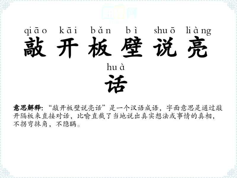 “敲开板壁说亮话”是一个汉语成语,字面意思是通过敲开隔板来直接对话,比喻直截了当地说出真实想法或事情的真相,不拐弯抹角,不隐瞒。