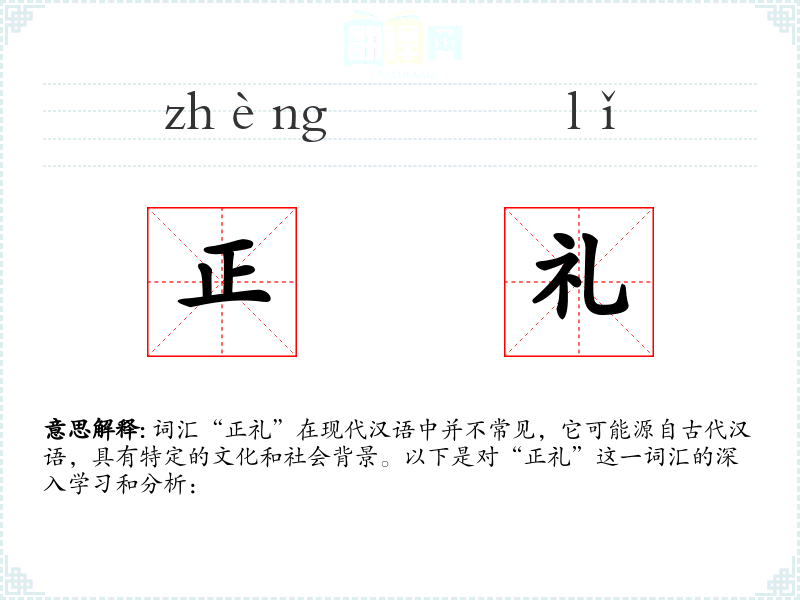 词汇“正礼”在现代汉语中并不常见,它可能源自古代汉语,具有特定的文化和社会背景。以下是对“正礼”这一词汇的深入学习和分析: