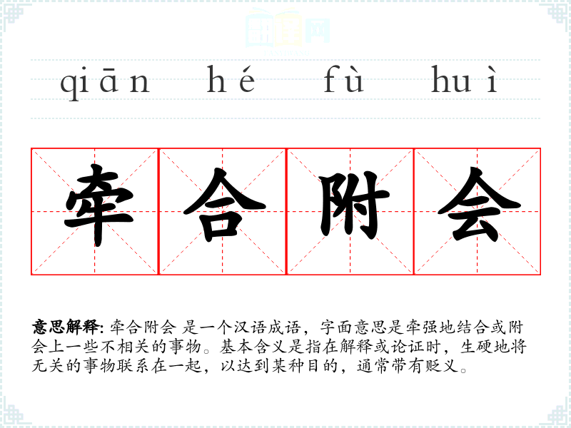 牵合附会 是一个汉语成语,字面意思是牵强地结合或附会上一些不相关的事物。基本含义是指在解释或论证时,生硬地将无关的事物联系在一起,以达到某种目的,通常带有贬义。