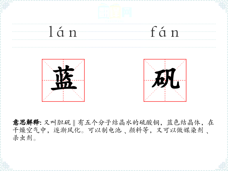 又叫胆矾‖有五个分子结晶水的硫酸铜,蓝色结晶体,在干燥空气中,逐渐风化。可以制电池﹑颜料等,又可以做媒染剂﹑杀虫剂。