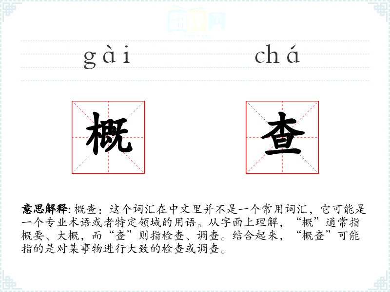 概查:这个词汇在中文里并不是一个常用词汇,它可能是一个专业术语或者特定领域的用语。从字面上理解,“概”通常指概要、大概,而“查”则指检查、调查。结合起来,“概查”可能指的是对某事物进行大致的检查或调查。