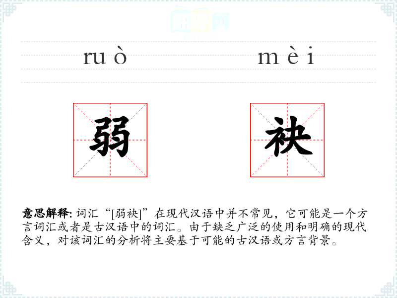 词汇“[弱袂]”在现代汉语中并不常见,它可能是一个方言词汇或者是古汉语中的词汇。由于缺乏广泛的使用和明确的现代含义,对该词汇的分析将主要基于可能的古汉语或方言背景。