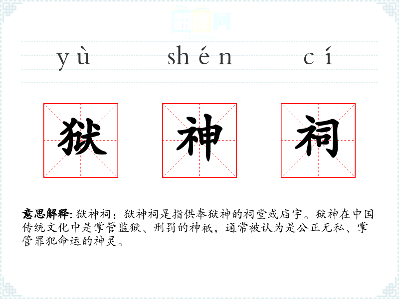 口语:在日常口语中,狱神祠可能不常被提及,但在涉及法律、监狱等话题时,可能会被用来比喻或象征公正和审判。