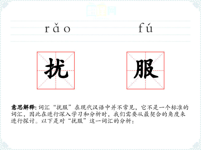 词汇“扰服”在现代汉语中并不常见,它不是一个标准的词汇,因此在进行深入学习和分析时,我们需要从最契合的角度来进行探讨。以下是对“扰服”这一词汇的分析: