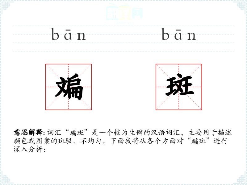 - 专业领域:在艺术、设计或地质学等领域,可能会用“斒斑”来描述特定的色彩或纹理效果。