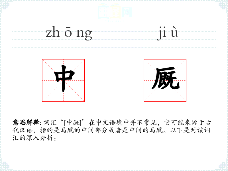词汇“[中厩]”在中文语境中并不常见,它可能来源于古代汉语,指的是马厩的中间部分或者是中间的马厩。以下是对该词汇的深入分析: