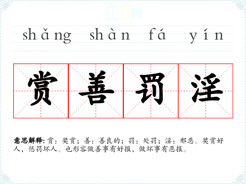 赏:奖赏;善:善良的;罚:处罚;淫:邪恶。奖赏好人,惩罚坏人。也形容做善事有好报,做坏事有恶报。