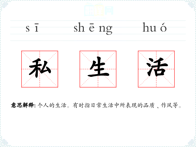 个人的生活。有时指日常生活中所表现的品质﹑作风等。