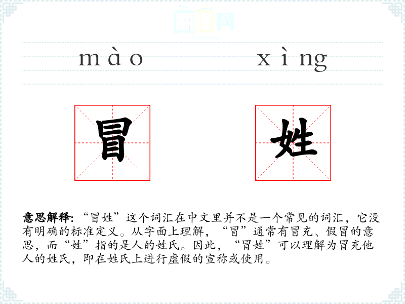 “冒姓”这个词汇在中文里并不是一个常见的词汇,它没有明确的标准定义。从字面上理解,“冒”通常有冒充、假冒的意思,而“姓”指的是人的姓氏。因此,“冒姓”可以理解为冒充他人的姓氏,即在姓氏上进行虚假的宣称或使用。