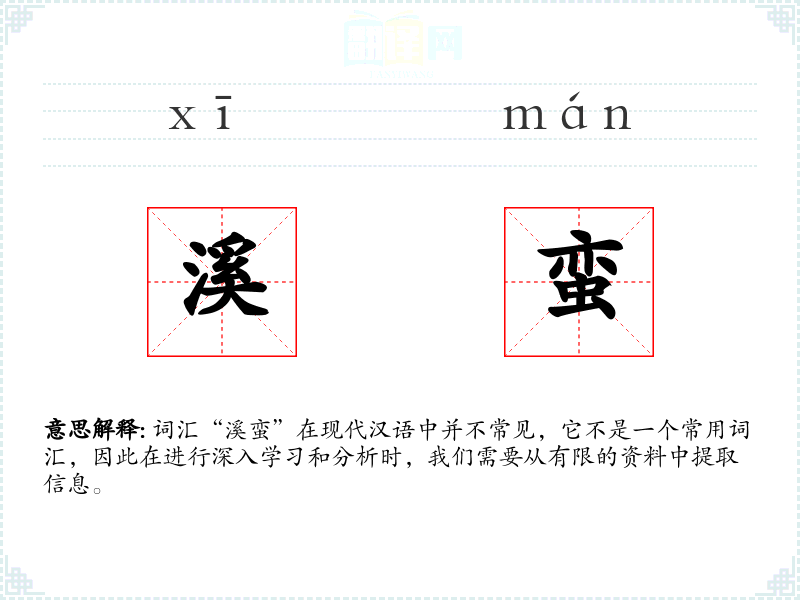 词汇“溪蛮”在现代汉语中并不常见,它不是一个常用词汇,因此在进行深入学*和分析时,我们需要从有限的资料中提取信息。