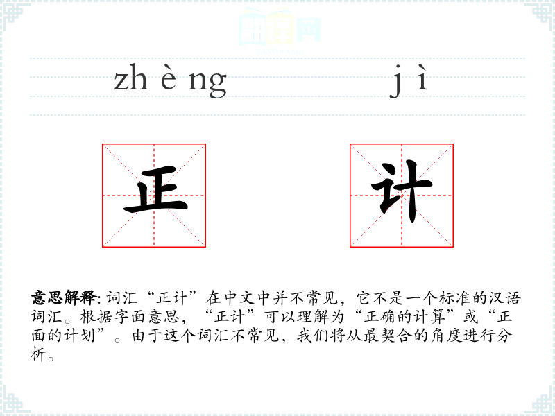 词汇“正计”在中文中并不常见,它不是一个标准的汉语词汇。根据字面意思,“正计”可以理解为“正确的计算”或“正面的计划”。由于这个词汇不常见,我们将从最契合的角度进行分析。