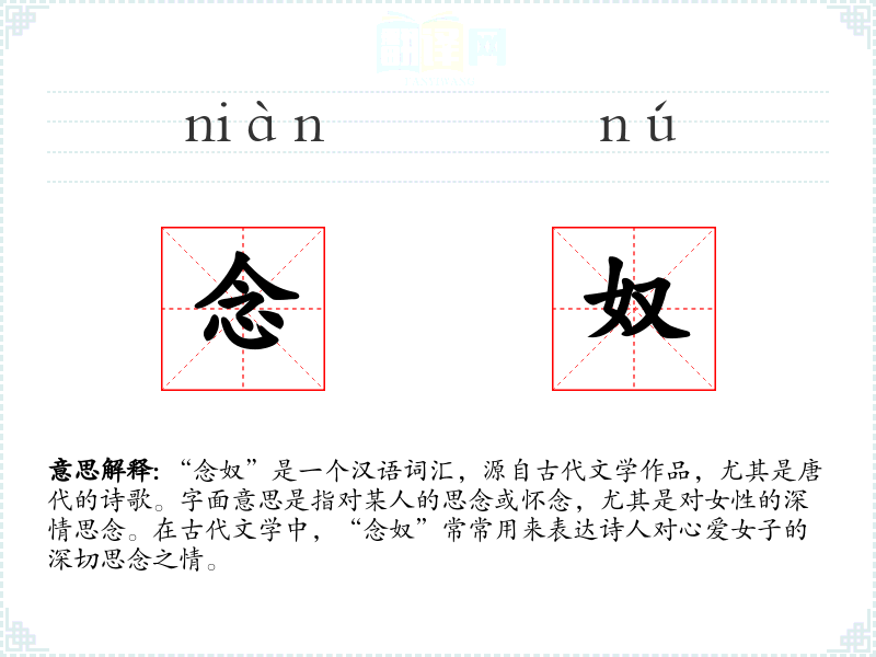 “念奴”是一个汉语词汇,源自古代文学作品,尤其是唐代的诗歌。字面意思是指对某人的思念或怀念,尤其是对女性的深情思念。在古代文学中,“念奴”常常用来表达诗人对心爱女子的深切思念之情。