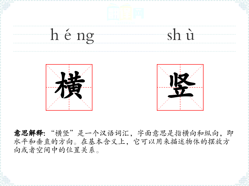 - 口语:在日常口语中,“横竖”常用来表示无论怎样、无论如何,如“横竖我都要去”表示无论如何都要去。